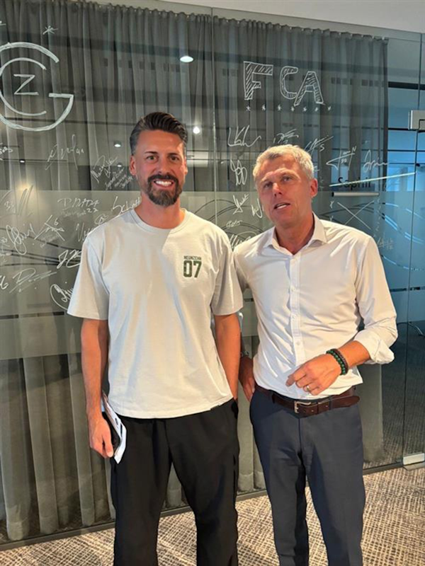 Hier wird der neue Cheftrainer vom FC Augsburg, Sandro Wagner, von Holger Lutzenberger, Geschäftsführer unseres Hotel Schempp, begrüßt. Wir freuen uns auf die Zusammenarbeit und eine erfolgreiche Saison sowie darauf, die Mannschaft regelmäßig bei uns begrüßen zu dürfen.